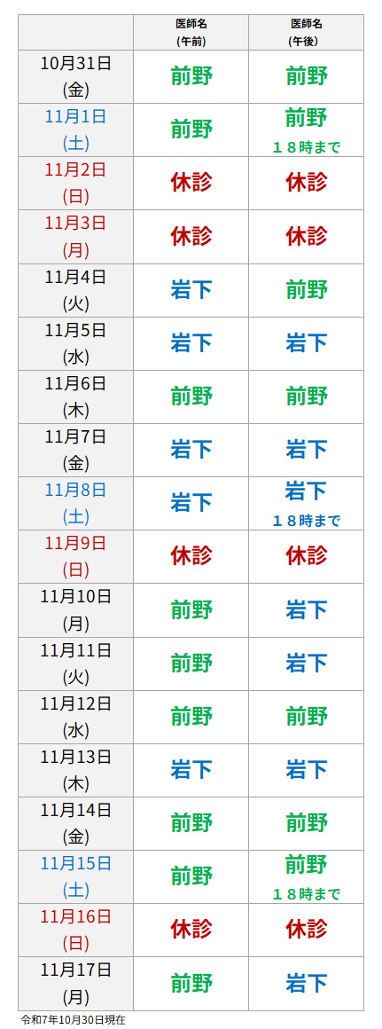 誠に申し訳ございませんが、このたび、令和7年11月から診療時間を変更いたします。